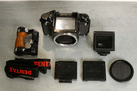 mit Prismensucher, Holzgriff, 2. Mattscheibe und Pentax-Gurt